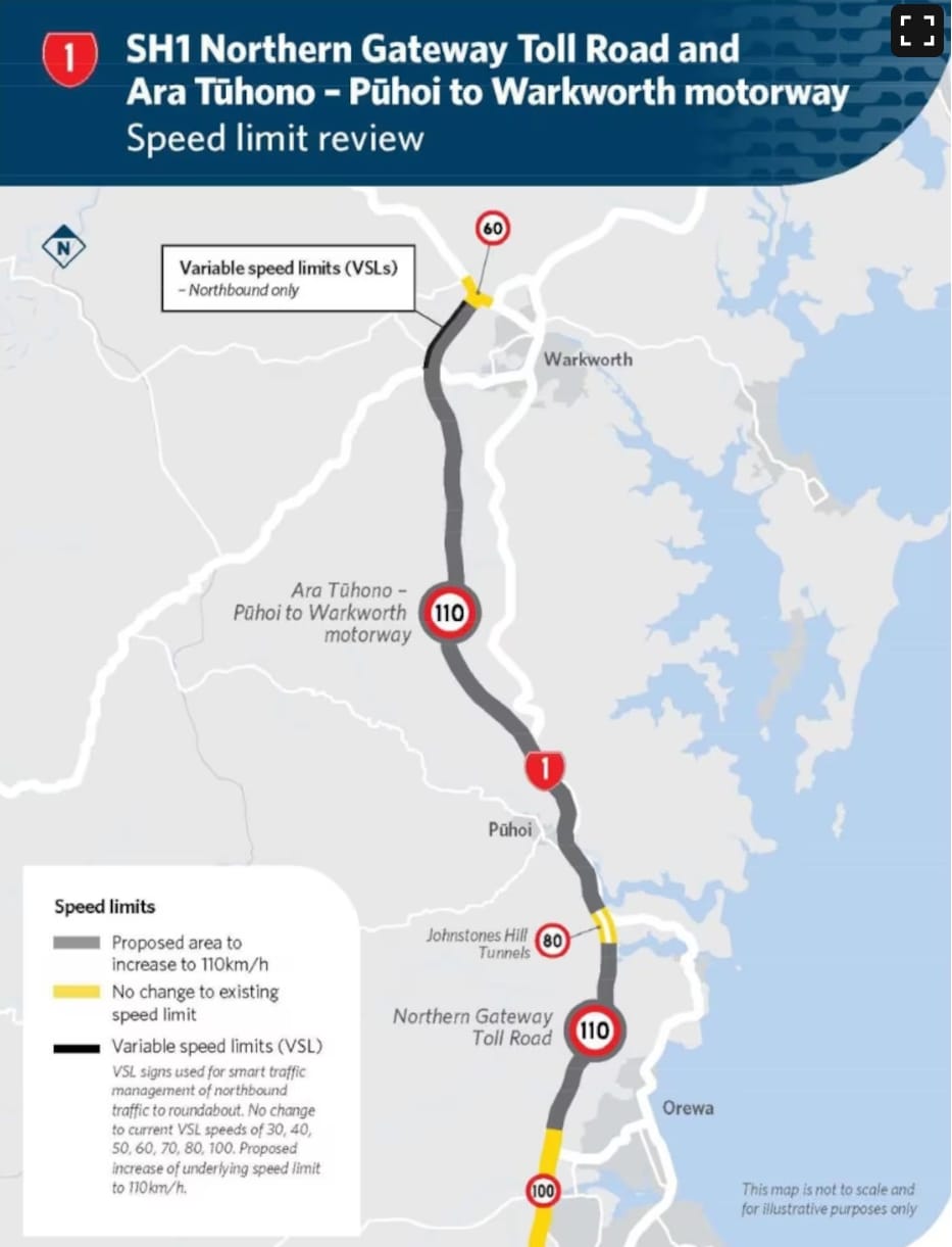 新西兰政府提议将Orewa至Warkworth之间的1号公路的限速提高到110公里/小时,减少两地旅行时间。