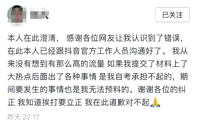 “谢谢各位的纠正,我知道挨打要立正,我在此道歉对不起。”