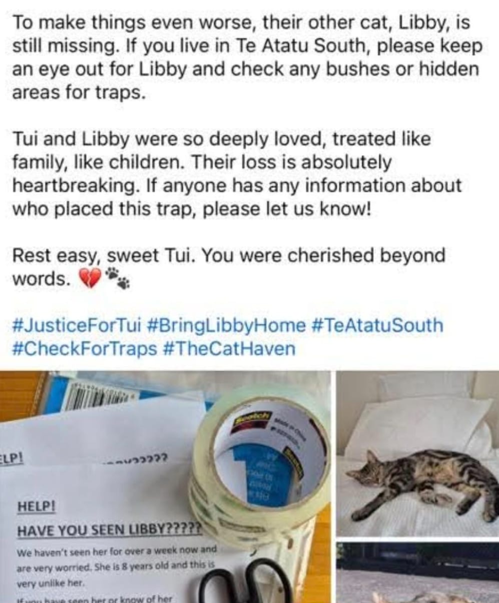 前几周,叫Libby的猫就失踪了。然后,到了3月30日(星期六),叫Tui的猫也失踪了。