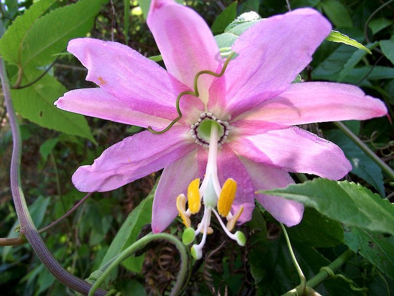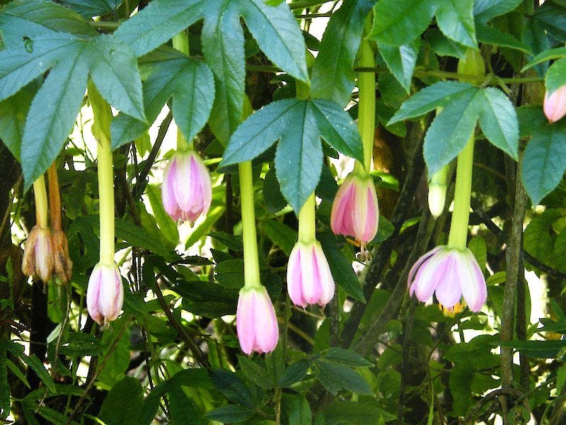 香蕉百香果的果子形状挺有趣,细长,对半切开,里面呈现出标准的百香果的形态,而且这种水果能吃,味道还是可以的。但为什么新西兰把它的树,判定为“害虫”pest 呢?这是因为香蕉百香果的是一种生命力旺盛的、司机常青的、能够高高的攀爬的藤本植物,它的藤能够爬到10米高,藤茎上长有很多密密的毛,叶子是分成三裂形状的,每片叶子长10公分左右,在新西兰的气候条件下经常开花,然后,就会在花中出现悬挂着的、细长的果实,薄皮多汁,香气颇佳。