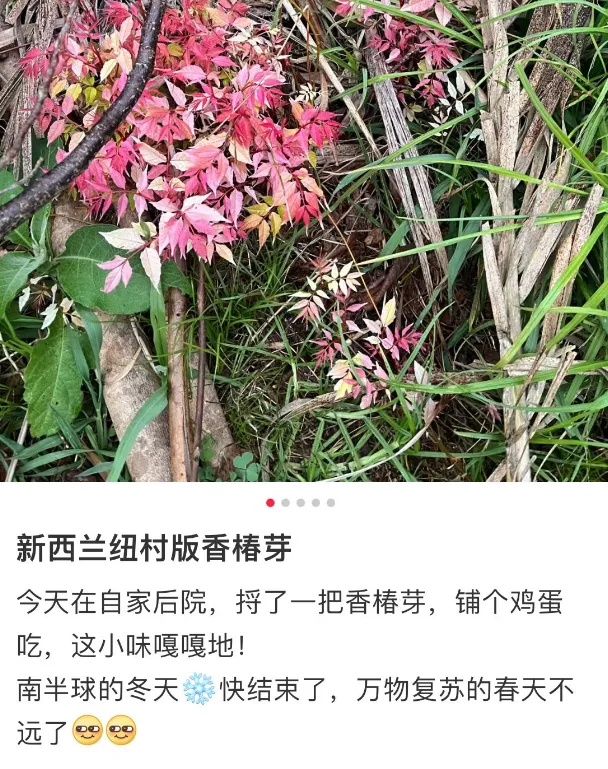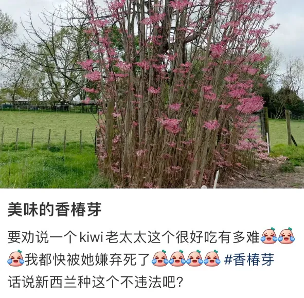 这颜值确实没得说,但是华人欣赏它,可不至于只喜欢外表这么肤浅。它们的味道,华人知道,因为华人是实实在在品尝过的😋。不少新西兰华人网友,在社交媒体分享自己摘粉色香椿吃的图文。