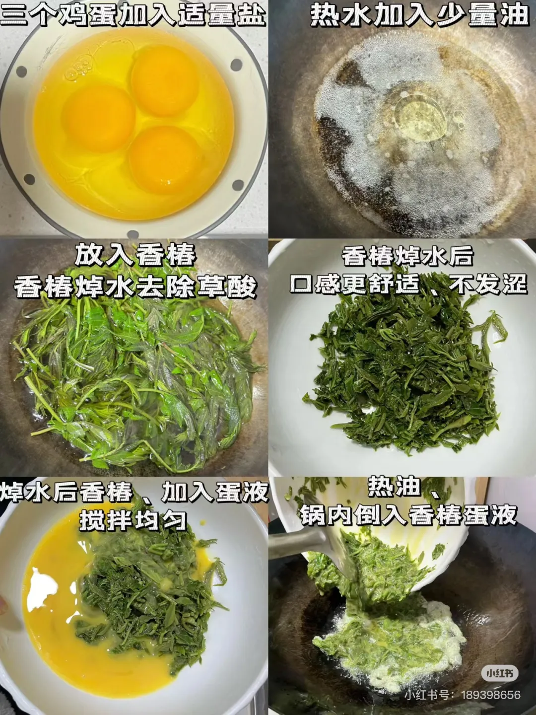做法:将香椿芽用热水焯一下,去掉草酸,焯水后过凉,切成小段。打散鸡蛋,加入切好的香椿段和少许盐搅拌均匀。锅中放油,油热后倒入蛋液,翻炒至鸡蛋金黄熟透即可。
