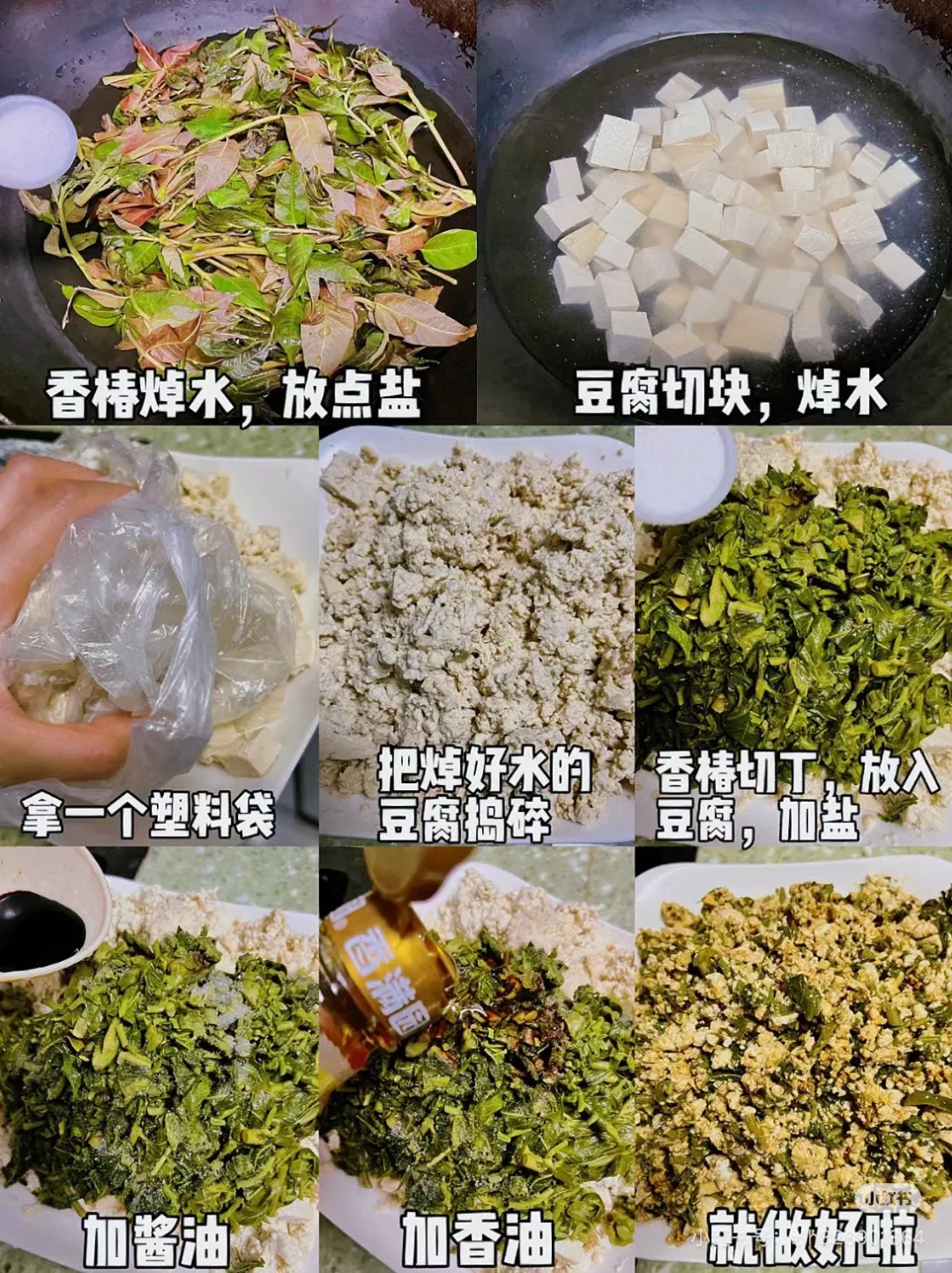 材料:嫩豆腐、香椿芽、盐、香油