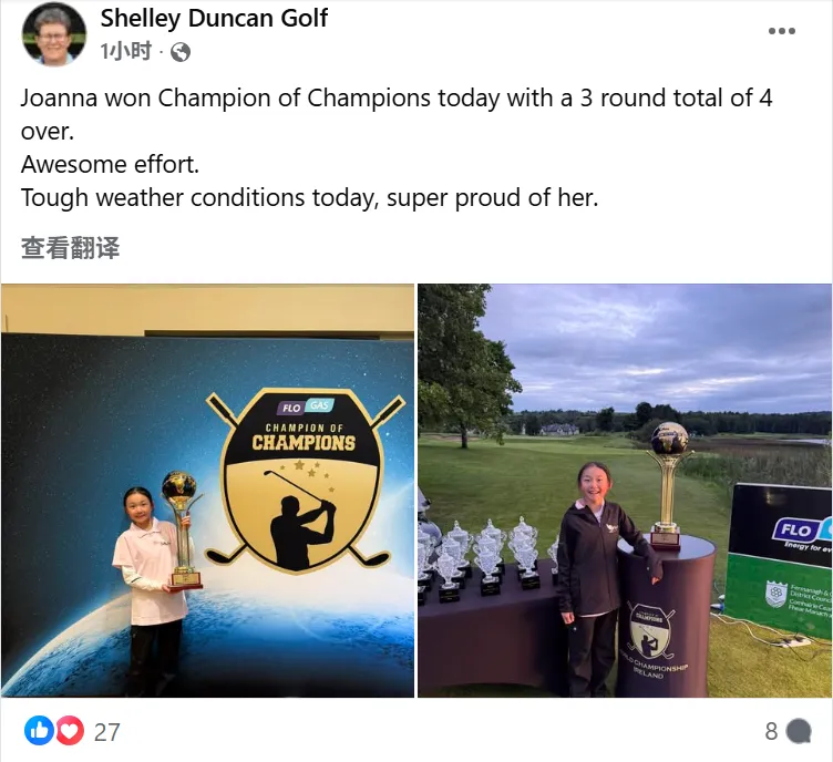 今天上午,Joanna在北爱尔兰厄恩湖举行的冠军中冠军赛上赢得了9岁以下女子组冠军,在三轮27洞的比赛中最终以高于标准杆4杆的113杆成绩结束比赛。