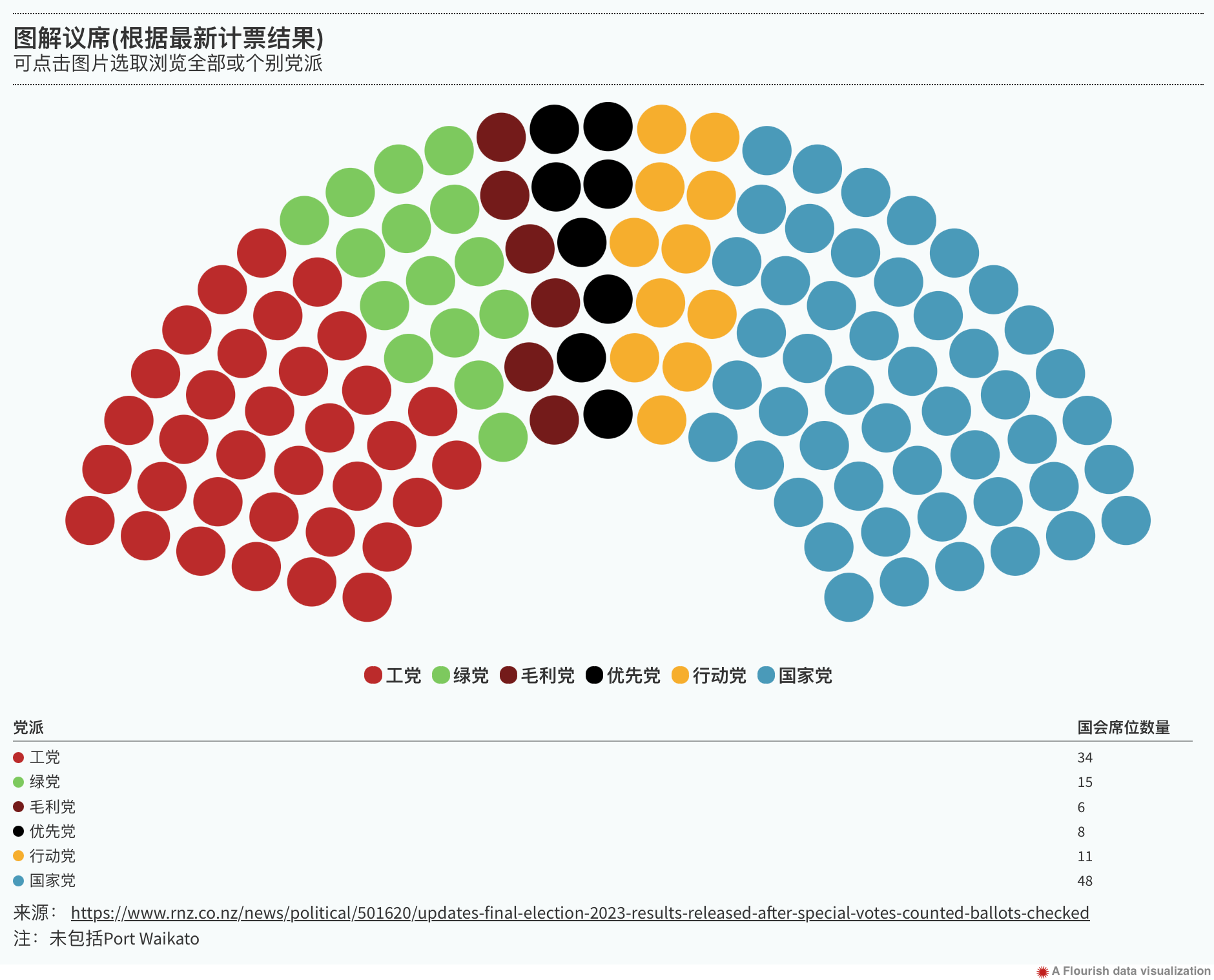 在特殊选票计票后,国家党失去两个席位,最后共计48席;毛利党获得两个新席位,共计6席,绿党收获一个新席位,共计15席;工党、行动党和优先党的席位则保持不变,分别为34席、11席和8席。