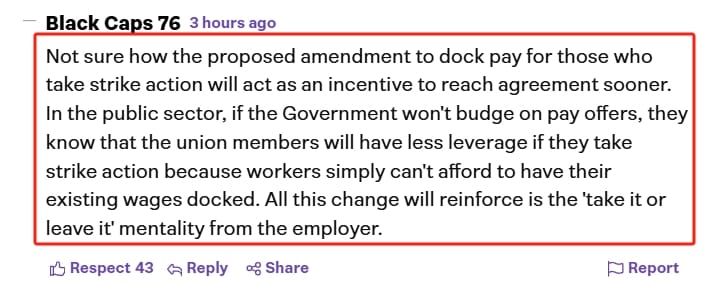 “不太明白这个削减罢工员工工资的提案到底怎么能促使双方更快达成协议。在公共部门,如果政府在薪资问题上态度强硬不让步,他们很清楚工会成员一旦罢工,手里的筹码就更少了,因为大家根本承受不起被扣工资的损失。