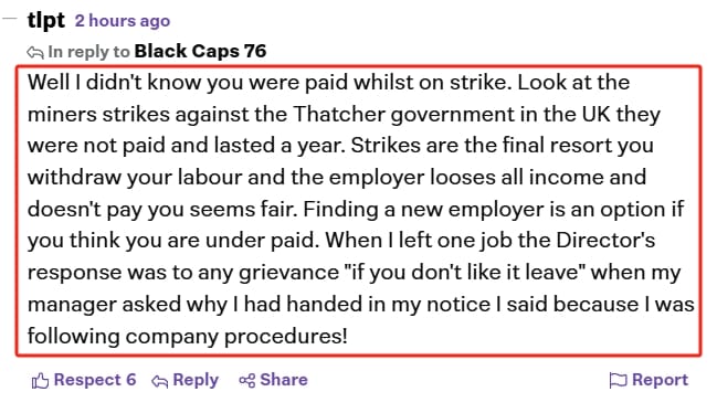 但也有其他网友回复说:“原来罢工期间还能拿工资?看看英国当年矿工对抗撒切尔政府的罢工,他们一分钱都拿不到,还坚持了一年。