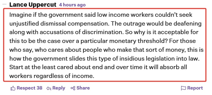 “想象一下,如果政府规定低收入工人不能申诉不当解雇,大家肯定会群情激愤,指责这是赤裸裸的歧视。那为什么一旦涉及高收入群体,就变得可以接受了?