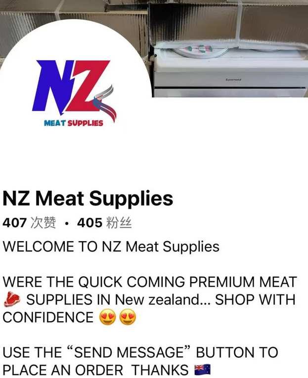 63岁的Aroha Hicks在Facebook的不同群组里,都看到了一家肉店的广告。这家店名字叫New Zealand Meat Supplies,说自己是新西兰本地供应商,有快速上架的各种肉类,大家可以发私信下单订购。