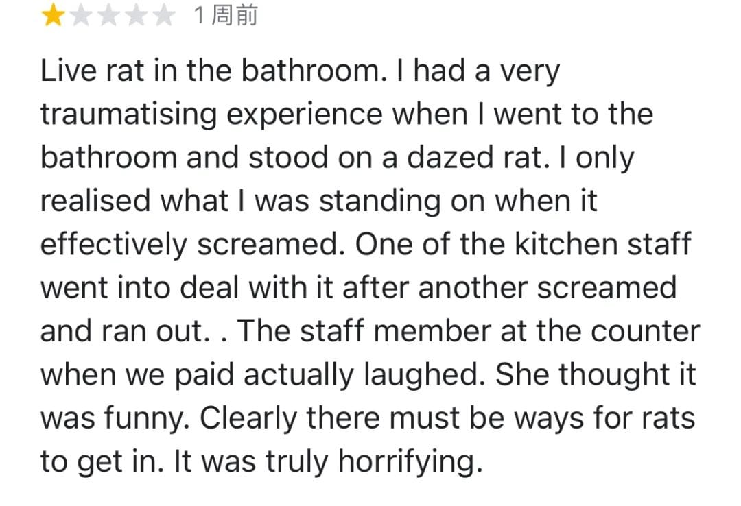 最近有个食客在朋友推荐下去尝鲜,结果体验很差,因为她在餐厅的卫生间里发现了一只活老鼠。这位顾客在Facebook和Google Review的帖子中,将自己的经历描述为“我一生中在餐厅最可怕的经历”。