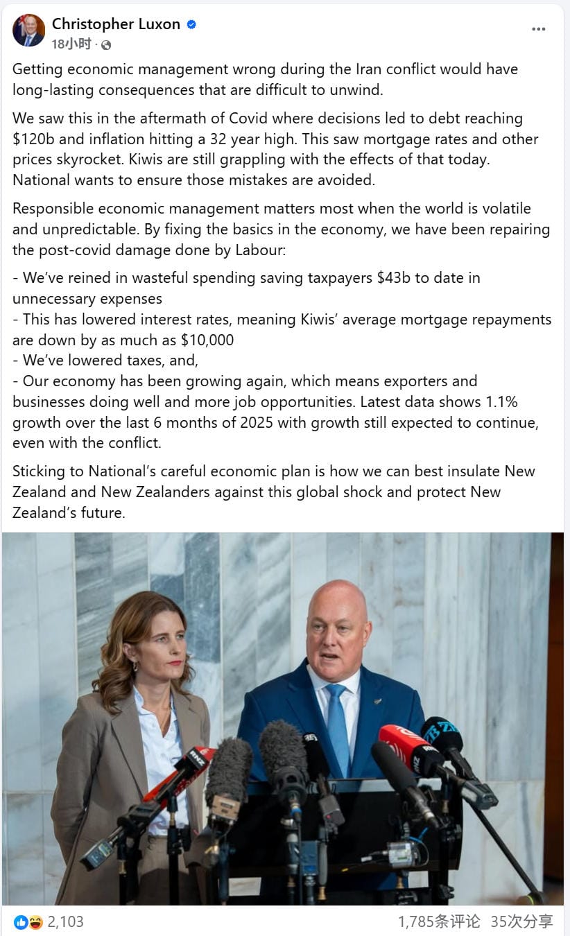 昨天,Christopher Luxon还在社交媒体上发布的一篇帖子,阐述了国家党政府在当前伊朗冲突背景下的经济管理立场。