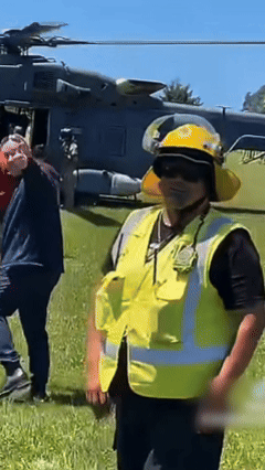 画面中,新西兰总理Christopher Luxon站在一架国防军直升机前,与一名身穿反光背心的消防人员交谈。