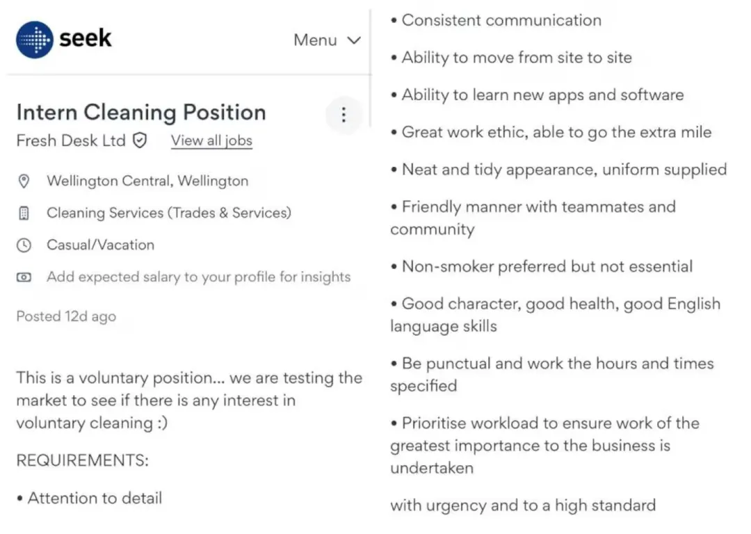 惠灵顿市中心的Fresh Desk公司,发布了这个岗位。职位名称是“实习清洁岗位”。“这是一个志愿者职位,我们正在测试市场,看看是否有人对志愿清洁感兴趣:)”