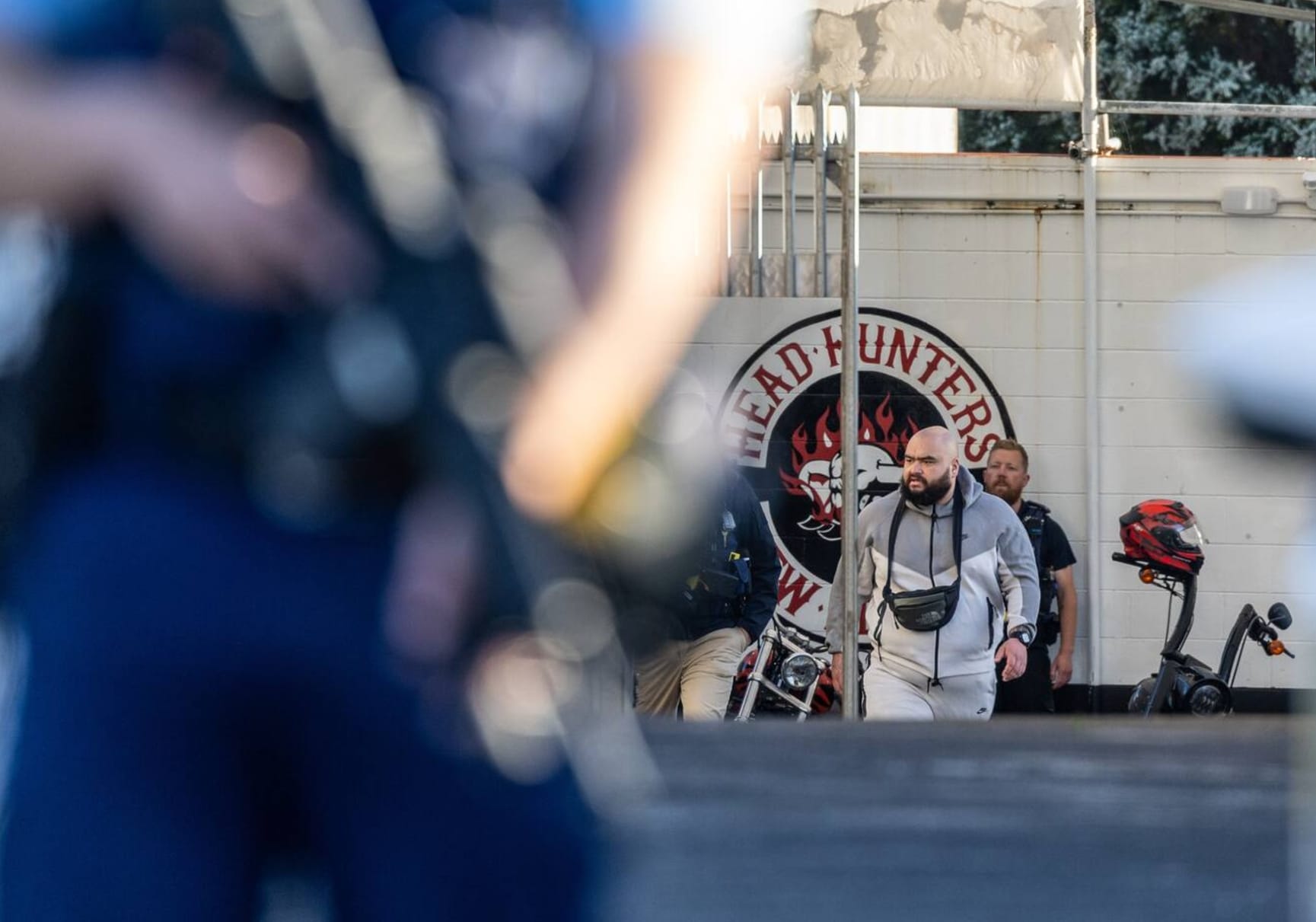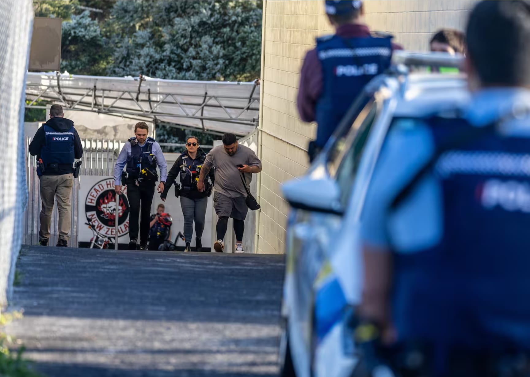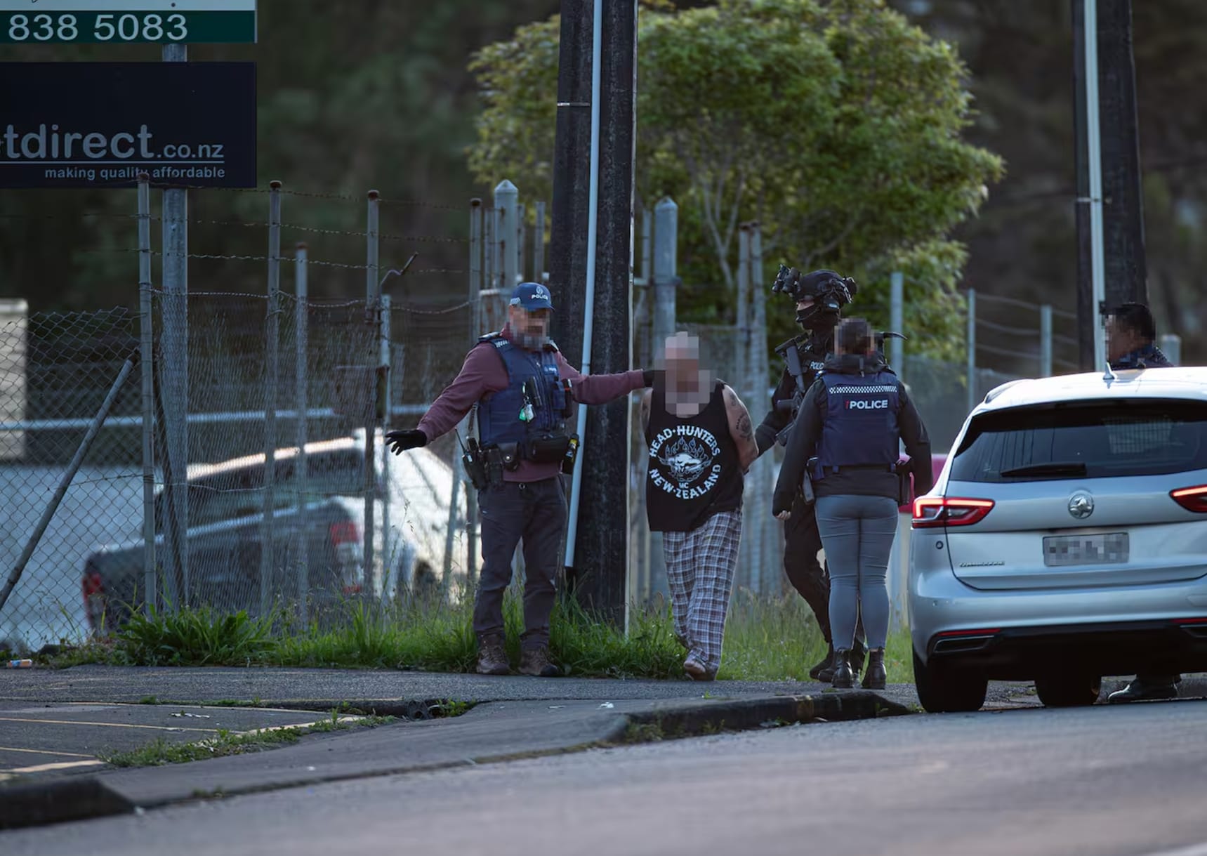 现场照片显示,位于奥克兰西区Henderson的Head Hunters据点,有穿着睡衣、戴着手铐的帮派成员被警方带离据点。