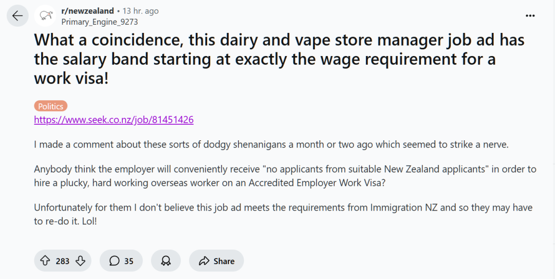 据这位楼主介绍,他无意中在招聘网站上看到了一个零售店和电子烟商店的招聘公告,发现薪资范围正好符合工作签证申请要求。
