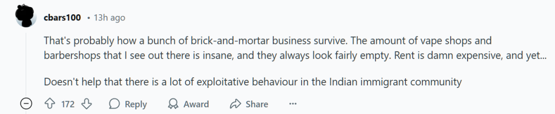 很快有人回了这个帖子,表示这些实体店暗藏玄机。“这可能是许多实体店的生存之道。“我看到的电子烟商店和理发店数量多得惊人,而且它们总是看起来相当空荡荡的。“租金非常昂贵,但是……“印度移民社区中存在大量剥削行为,这无济于事。”