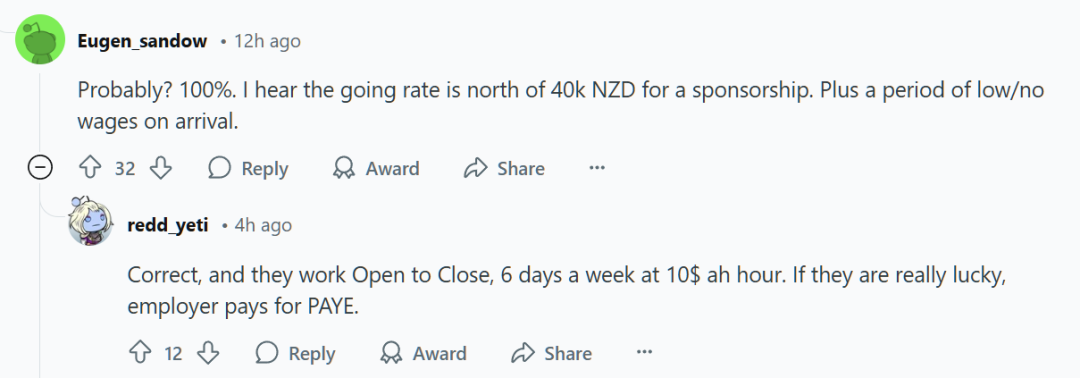 “我听说赞助费超4万纽币。“此外,刚开始工作时还有一段低工资或无工资的时期。 ”