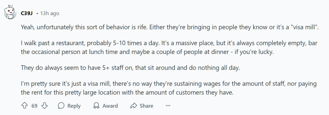 也有人怀疑有些餐厅也不正常。“是的,不幸的是,这种行为很普遍。“他们要么招自己认识的人,要么就是签证工厂。“我每天大概会路过一家餐馆5-10次。这家餐馆很大,但总是空无一人,除了午餐时间偶尔有人,晚餐时间也许会有几个人——如果你够幸运的话。“他们似乎总是有5名以上的员工,整天坐着无所事事。“我确信这只是一个签证工厂,他们根本没有办法维持这么多员工的工资,也没有办法支付这么多客户所占这么大店面的租金。”