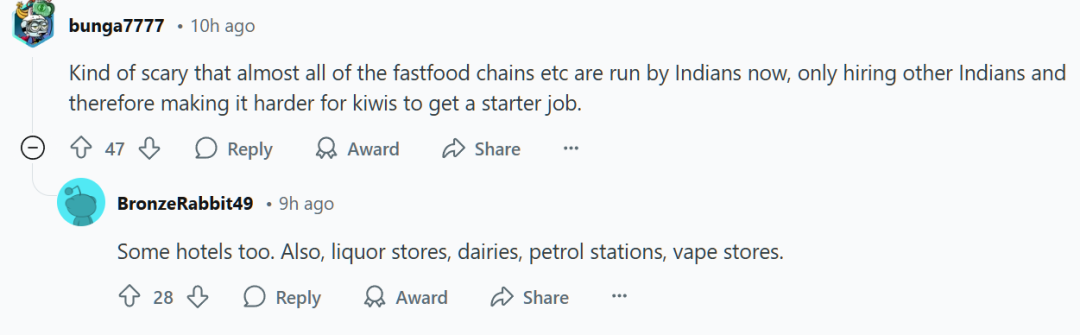 有网友觉得这种情况很可怕。“现在几乎所有的快餐连锁店等都是由印度人经营的,他们只雇佣其他印度人,因此让新西兰人更难找到一份初级工作。”“有些酒店也是这样。此外,还有酒类商店、零售店、加油站、电子烟商店,也有类似的情况。”