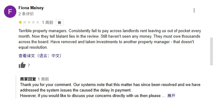 “糟糕的物业管理公司!长期拖欠房东租金,让我们每个月都蒙受损失。现在他们甚至在评论中公然撒谎,但我们仍然一分钱未收到。估计他们欠下的金额相当可观。