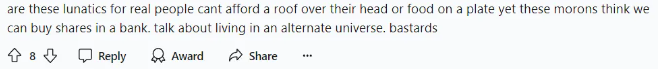 “提出这种建议的人是疯了吗?我们买不起房,买不起食物,他们觉得我们会买得起银行股份?”