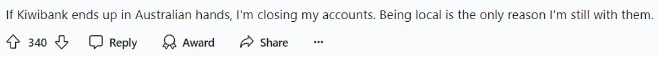 “如果Kiwibank落入澳大利亚之手,我就会关闭我的账户。本地化是我依然坚持用Kiwibank的原因。”