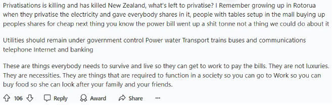 不仅是银行业,有人对新西兰其他行业的私有化也满腔怨言:
