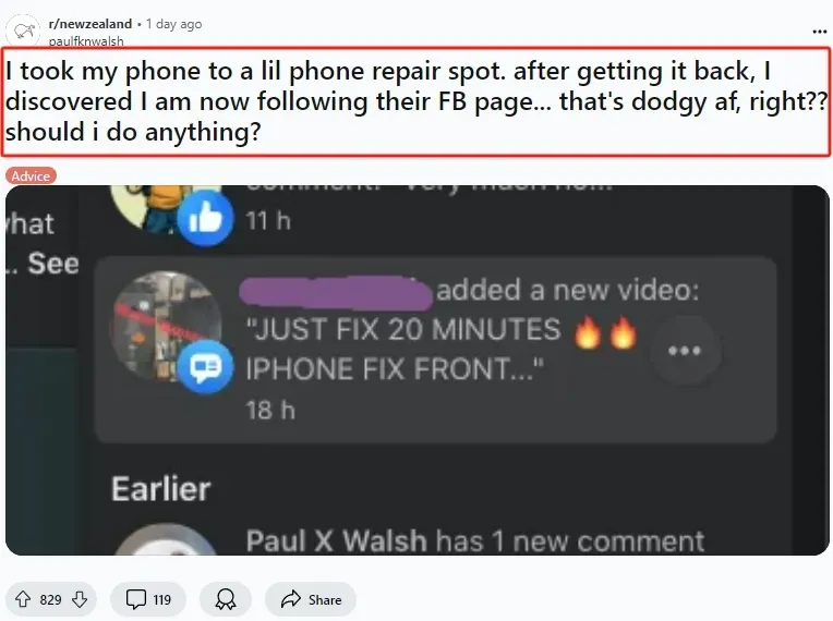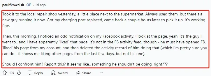 网友在帖子中称:我把手机拿去了一家小维修店去修,拿回手机后我发现自己关注了他们的Facebook页面......
