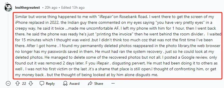 “我在2022年去过奥克兰Rosedale的一家维修店换iphone屏幕,当时一个印度店员用一种毛骨悚然的方式说了两次‘你的眼睛很漂亮’,我感到非常不舒服。