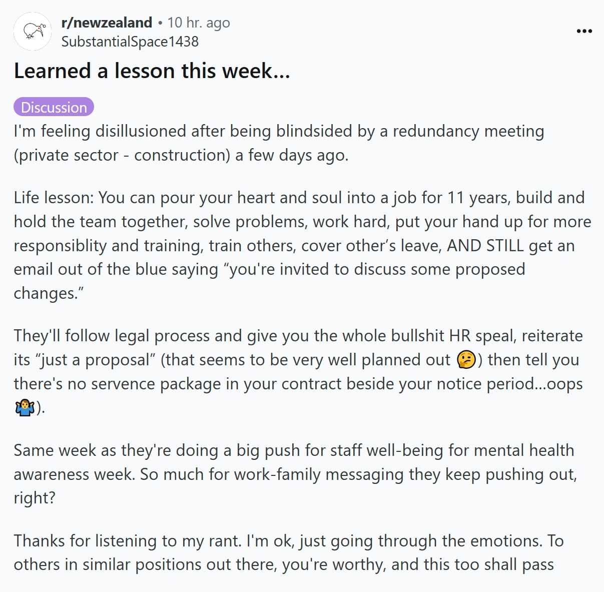 对于第一个故事,新西兰的网友普遍认为有些公司很恶心,宣传所谓员工心理健康,一边裁员,”毫无诚意可言“。