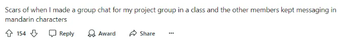 “有一次小组作业我拉了个群,结果大家都在里面发中文,我很伤心。”
