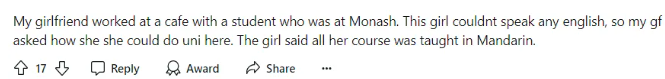“我女朋友在咖啡店的同事是莫纳什大学的,那个女孩一点英语都不会。我女朋友问她怎么完成课程,她说她所有的课都是中文普通话授课。”