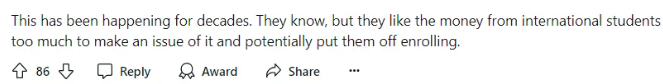 有网友指出,“几十年来都是如此,大学不是不知道,只是留学生给的学费实在太多了,他们没法拒绝。”