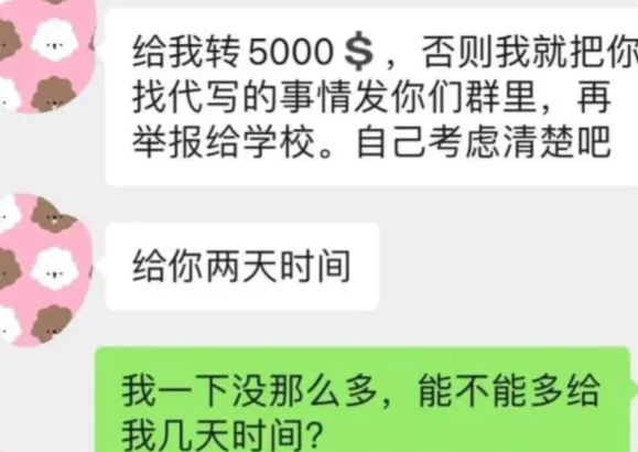 美国一所藤校中国留学生找人代写后,被索要5000美元“封口费”,并威胁如果不给就把代写的事举报给学校。