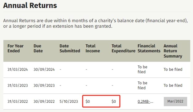 根据新西兰政府慈善服务局的公开信息,信托唯一提交过的财务申报表是截至2022年3月年度,而且提交时间还迟了一年多。