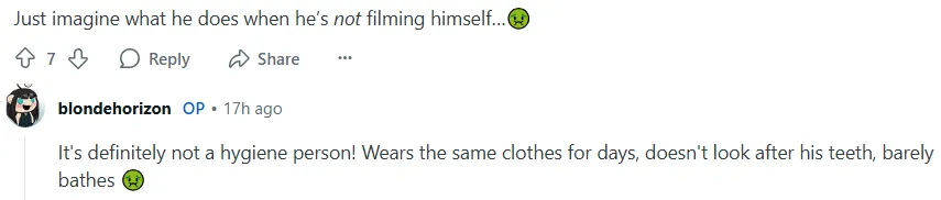 “想象一下他没拍摄视频的时候会做些什么……这个人绝对不卫生,一件衣服穿很久,牙齿很脏,几乎不洗澡。”