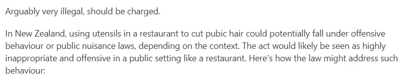 “在新西兰,在餐厅使用餐具剪阴毛可能会被视为冒犯行为或公共滋扰法,取决于具体情况。在餐厅这样的公共场合,这种行为可能被视为非常不恰当和冒犯。”