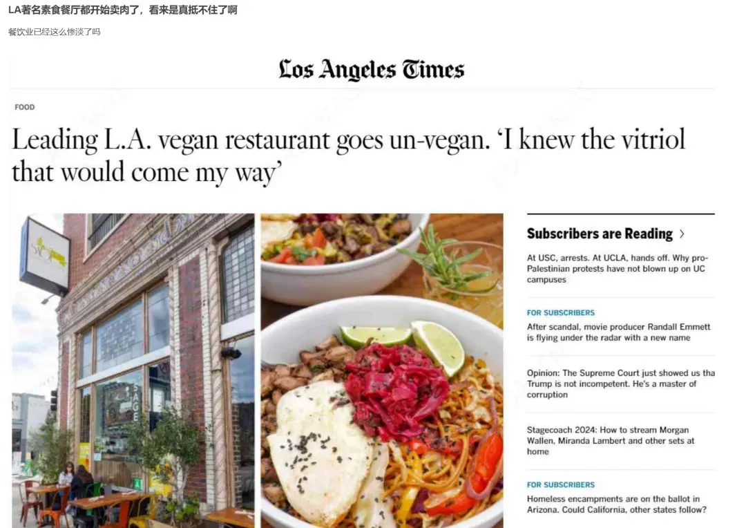 LA的一家著名素食餐厅决定转型,2024年4月22日主厨Mollie Engelhart在社群上宣布,她的素食餐厅要开始卖肉类和乳制品。