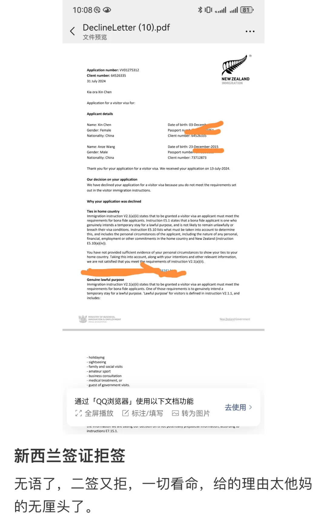 被拒签的两个人连补交材料的机会都没有,现在只能重新递签申请。重新递签时还需要补充一堆新的材料,例如父母工作证明、存款证明、房产证明等。“要不是买了机票,直接就不去了,还要上赶着给新西兰送钱,一想到就一肚子气。”