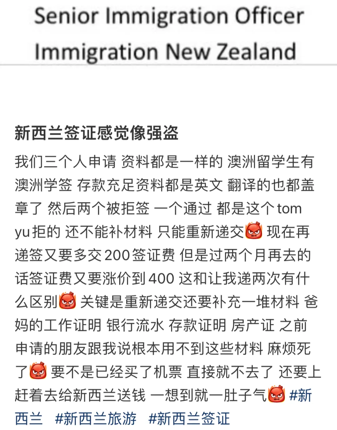 最近在中文社交媒体上,很多华人反映“新西兰旅游签拒签率高”的问题,不少人分享自己的被拒案例。