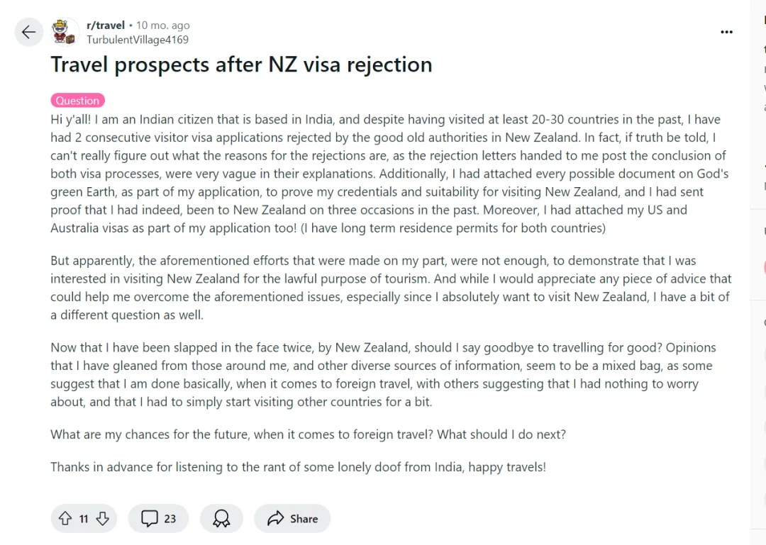 除了中国人,其他国家的人在申请新西兰签证时,也遇到了类似的问题。有个有澳洲和美国长期旅游签证的印度人在网上发帖,说自己去过二三十个国家,但是申请了两次新西兰访问签证都被拒绝了。最重要是他搞不清楚被拒原因是什么,因为每次的拒绝信都模棱两可,所以他不知道自己可以补什么材料。