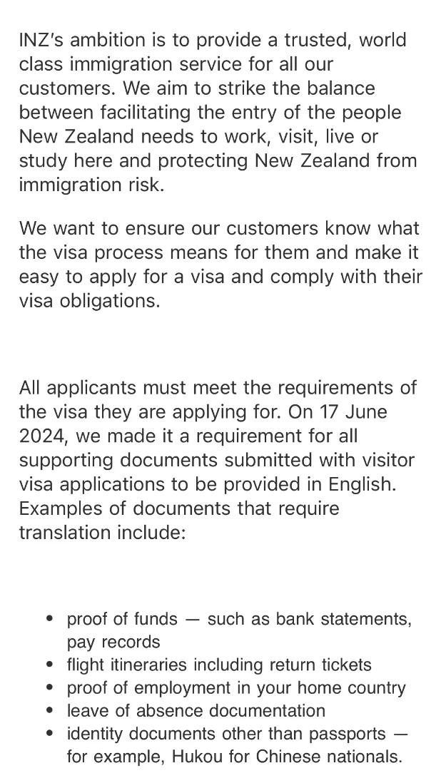 “新西兰移民局的目标是为所有客户提供值得信赖的世界级移民服务。我们的目标是在方便新西兰需要工作、访问、生活或学习的人入境和保护新西兰免受移民风险之间取得平衡。“我们希望确保我们的客户了解签证流程对他们意味着什么,并让他们能够轻松申请签证并履行签证义务。“所有申请人必须符合所申请签证的要求。2024年6月17日,我们要求所有随访客签证申请提交的证明文件均以英文提供。需要翻译的文件示例包括: