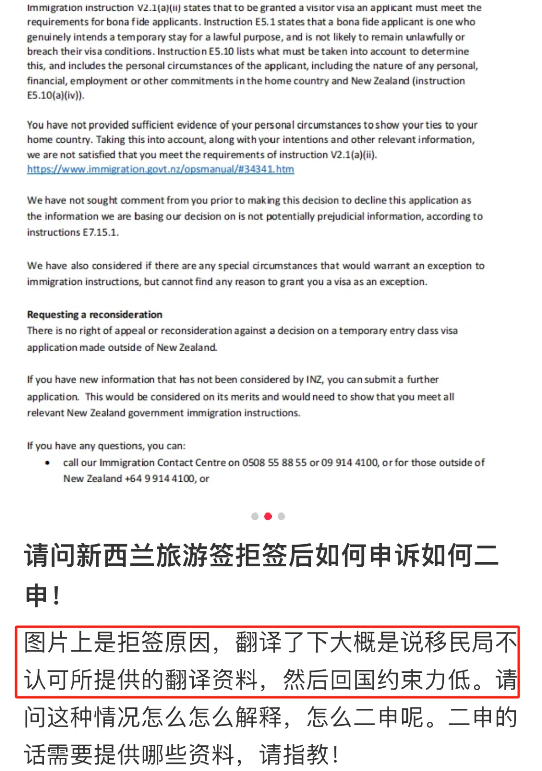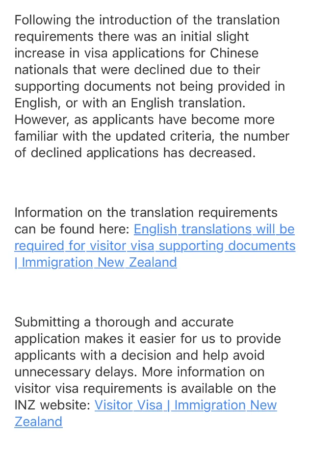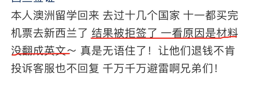 综上所述,新西兰移民局那边给出的拒签主因是:一些申请者拒签原因是没有按要求翻译。现实中确实不少申请者,是在翻译资料上遇到了麻烦。例如有人分享自己拒签是因为“翻译资料不合格”和“回国约束力不足”。