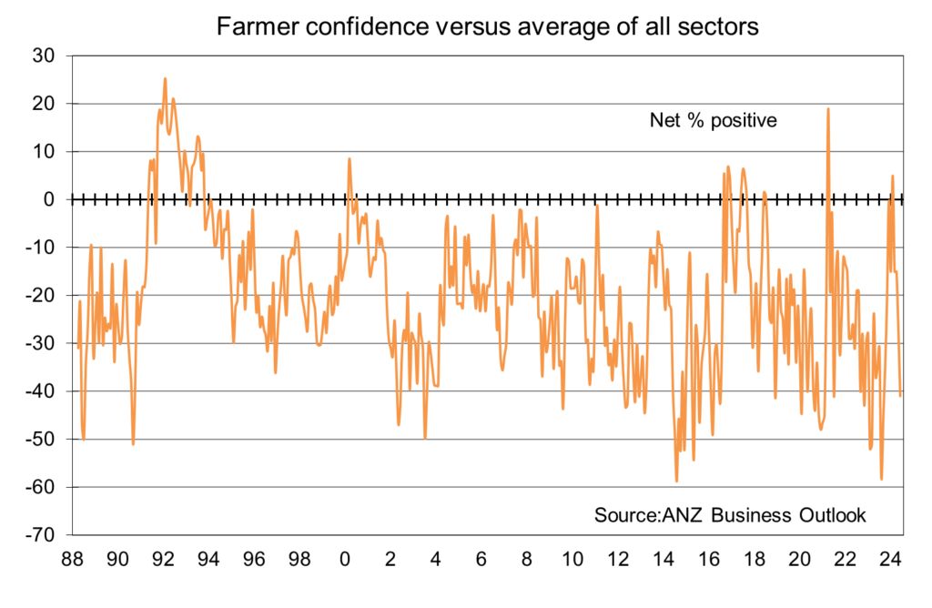 最后这张图比较了自1988年以来,澳新银行调查中农民的信心水平与各行业的整体信心水平。农民的信心水平高于其他商人的情况极为罕见。事实上,自1988年以来,农民的平均净负面展望为15%,而建筑和服务行业经营者的平均净正面展望为10%,零售业为7%,制造业为4%。