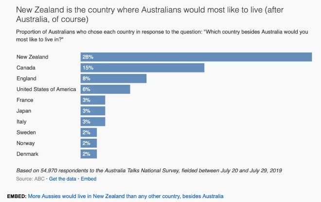 在ABC的Australia Talks的一次全国调查中,多数澳大利亚人认为自己已经居住在全世界最好的国家了,但是当被问到如果一定要选别的地方生活的话,大多数人都选择了新西兰。