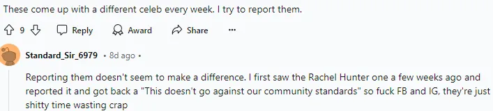 “举报没什么用,我几周前看到Rachel Hunter的时候就举报了,结果平台跟我说‘对方没有违反社区规则’,FB和IG已经成了垃圾聚居地。”