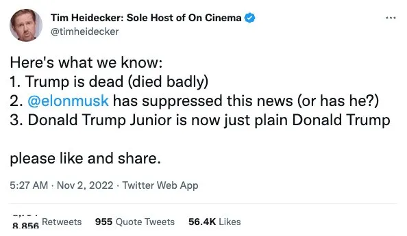 闹得沸沸扬扬的是在2022年,一条带有“#特朗普死了(#TrumpIsDead)”标签的消息在X上疯狂传播,最终转贴超过几十万。