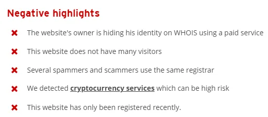 比如,它是个最近注册的网站、访客不多、网站所有者隐藏了身份、提供的虚拟货币服务存在高风险等。