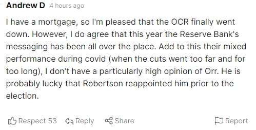 有网友留言说:“我有房贷,所以很开心看到OCR降了,但我也觉得今年储备银行有些混乱,加上之前疫情期间的长时间降息,也让我对行长的评价不太高。”