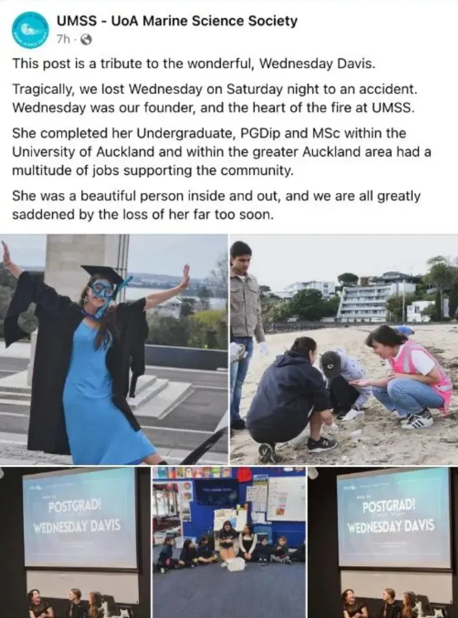 奥克兰大学海洋科学协会Facebook页面上的帖子称,Davis是“内外兼修的好人”,“我们都为她过早离世感到非常悲痛”。
